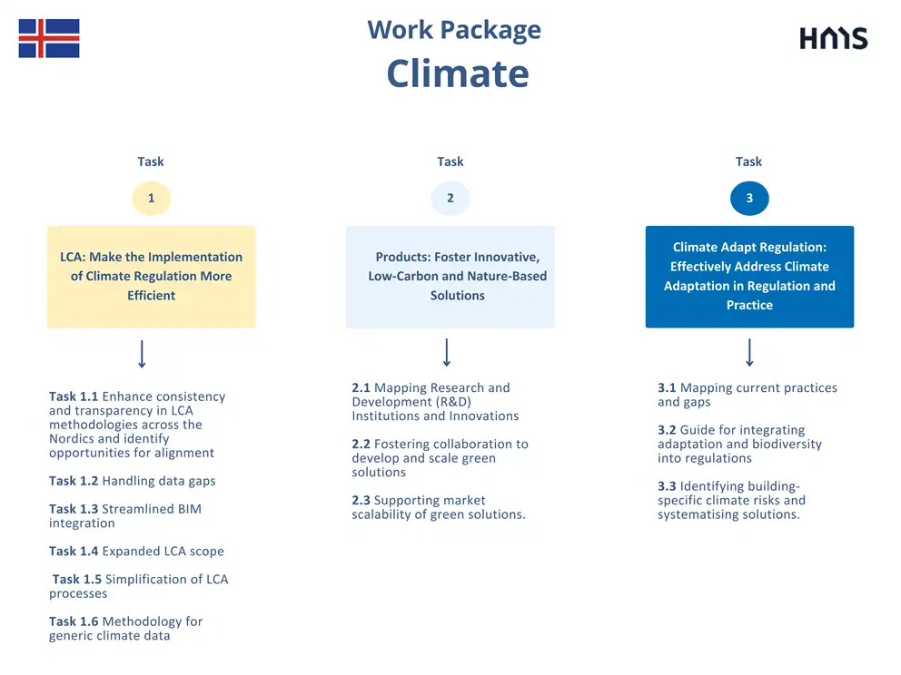The aim of this work package is to strengthen climate resilience and reduce the environmental impact of the built environment by improving LCA methodologies, promoting low-carbon and nature-based materials, and systematising climate adaptation strategies. By harmonising standards, addressing data gaps, and fostering collaboration across the Nordics, the work package ensures a more streamlined and effective implementation of climate policies in construction. It also seeks to support innovation and scalability of sustainable solutions while equipping policymakers and industry stakeholders with the tools to integrate climate adaptation and biodiversity into building regulations.